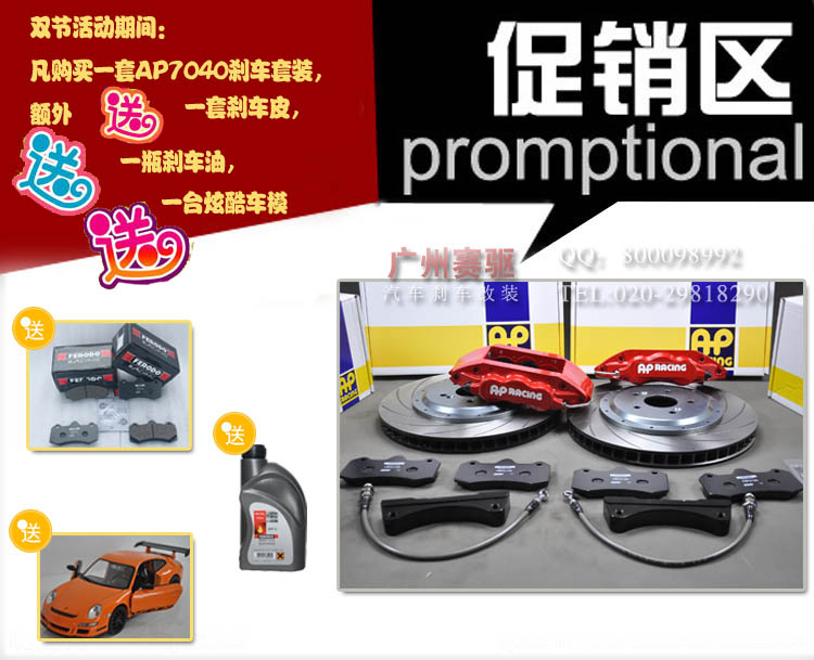 廣州賽驅汽車改裝貿易有限公司:九月促銷活動現正式開始!時間是9.21到9.30結束。活動促銷最劃算是AP7040大六剎車套裝主要促銷產品,現在購買即送超值大禮包!
