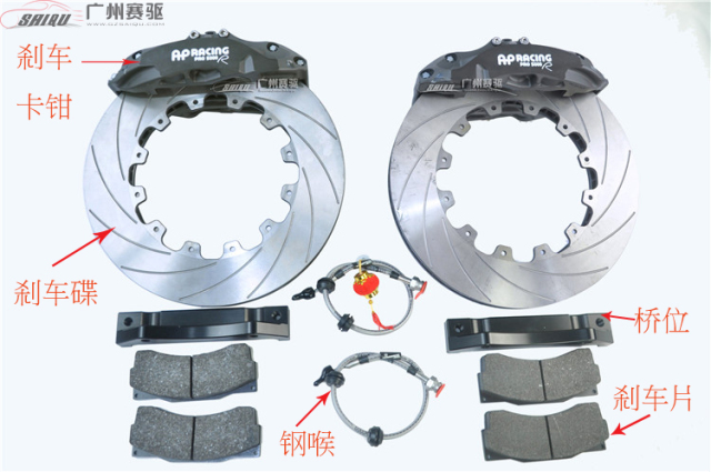 一般整套剎車改裝套裝會有:剎車卡鉗、剎車片、剎車碟、剎車油、鋼喉、合頭橋位。(下圖沒有放合頭)