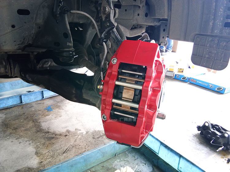 改裝后效果,六活塞卡鉗完美與輪轂融合在一起;