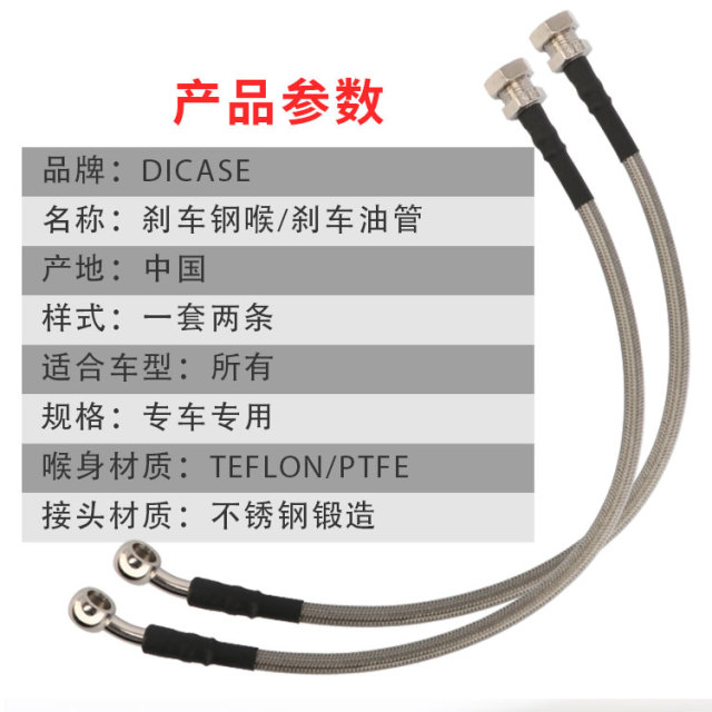 剎車鋼喉是通過傳送剎車油,推動剎車卡鉗活塞工作的一個重要部件。大多數的原車剎車鋼喉都是橡膠制成的,所以在長時間的使用后,會出現老化,漏油等問題。通常建議2到3年對剎車鋼喉進行檢查,確保駕駛安全。 很多人錯誤地認為原車的剎車鋼喉是廠家原配的,符合相應法規和標準的,應該選擇原廠剎車鋼喉。其實不然,原車的鋼喉由于成本問題,在制作工藝,原材料選擇等問題上就會有所取舍,最終的成品也只是能滿足車輛一般制動要求的。所以在更換剎車鋼喉的時候,我們比較建議選擇專業的高性能剎車鋼喉,例如DICASE。