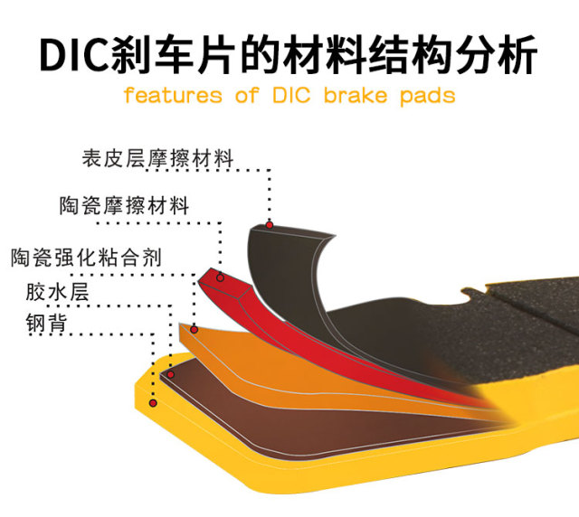 DICASE剎車片的鋼板經過特殊涂料涂裝防銹,涂裝過程擁有精準溫度分布來保證質量。其中隔熱層是由不傳熱的材料組成,目的是隔熱。摩擦塊由摩擦材料、粘合劑組成。DICASE的摩擦材料是新型復合陶瓷材料,耐高溫,耐磨,而粘合劑是采用新加坡技術的陶瓷粘合劑,更加牢固,耐高溫。