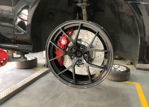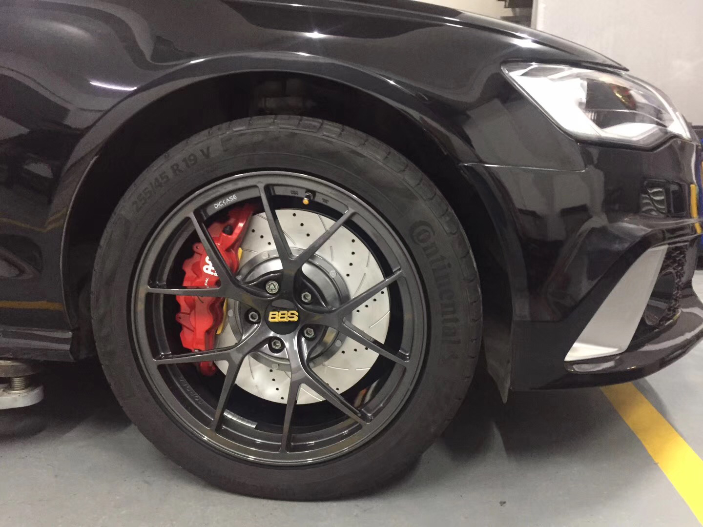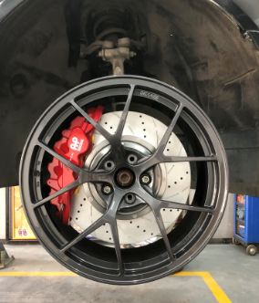奧迪A6升級AP8520六活塞剎車套件,搭配DICASE 380mm孔線高性能剎車盤,隨時想剎就剎,輸出強大,性能穩定,19寸輪轂即可安裝。