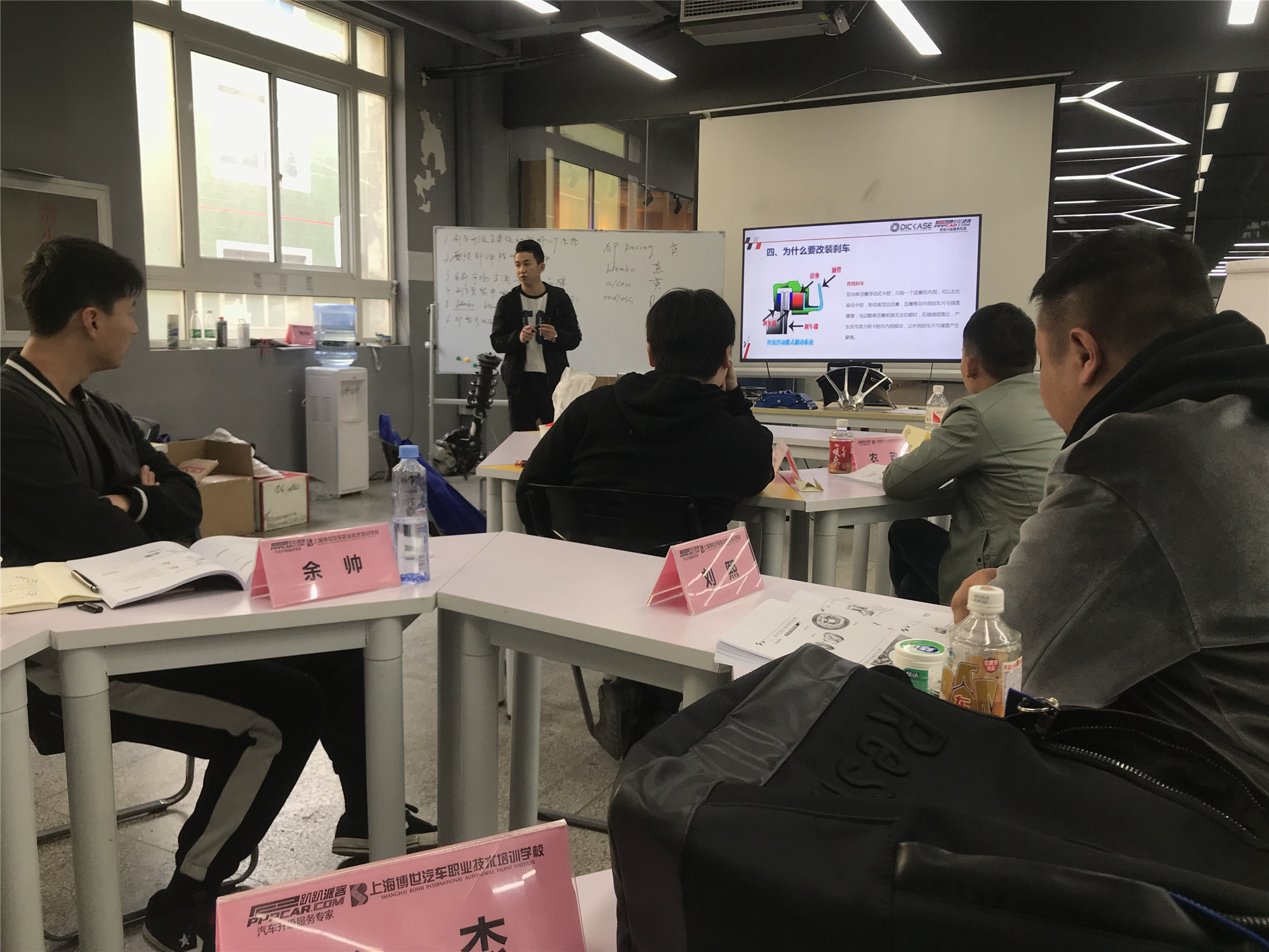 賽驅(qū)李講師利用現(xiàn)場(chǎng)剎車(chē)改裝件,向?qū)W員講授汽車(chē)剎車(chē)改裝的各大品牌,汽車(chē)制動(dòng)原理,汽車(chē)原裝卡鉗和改裝卡鉗的優(yōu)劣等內(nèi)容。讓學(xué)員可以更加深入得了解我們的改裝行業(yè)。