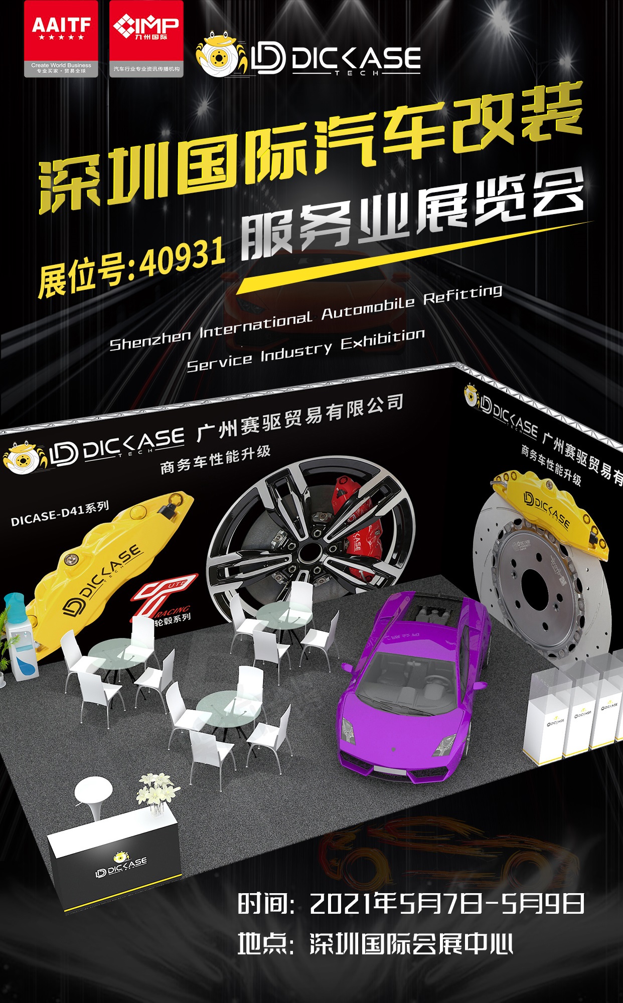 2021年5月7日-2021年5月9日,在深圳國際會展中心舉辦亞洲最大的智慧出行、汽車改裝及汽車服務業生態博覽會,名為AAITF九州展,會有很多汽車汽配商、改裝生產商、代理商前來參展。