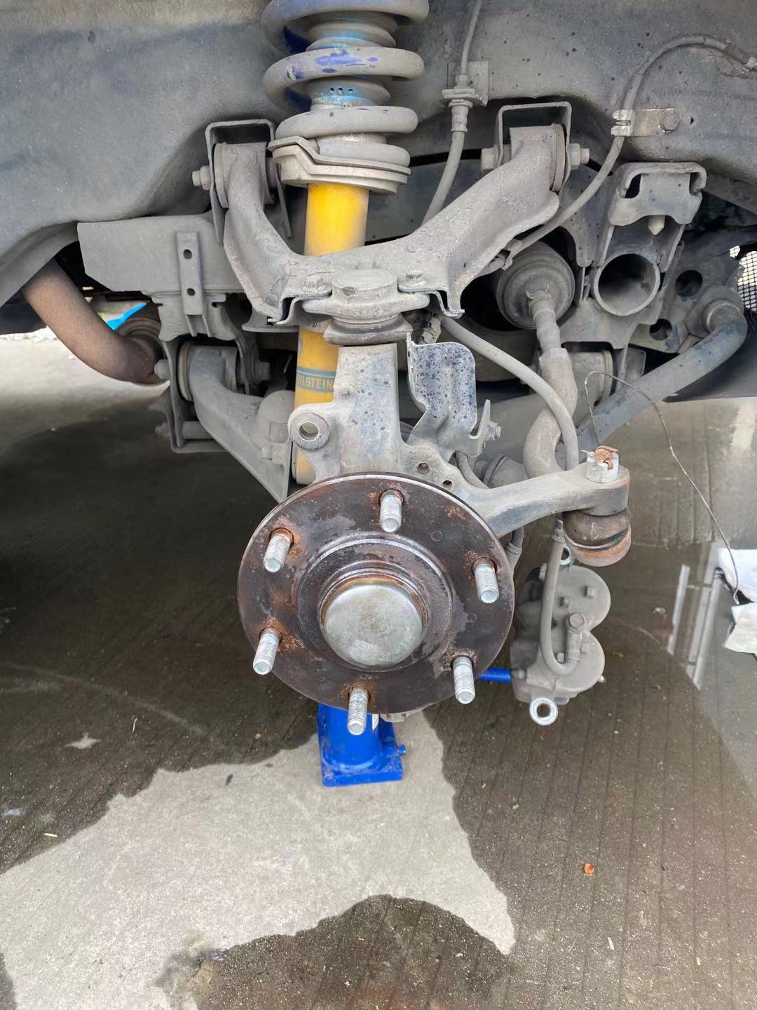 然后就是拆輪轂,拆剎車,拆掉卡鉗的固定螺絲,然后拿下卡鉗,拿下剎車盤,看似很簡單,實際上并沒有那么順利,剎車盤銹死,剎車片也卡住了盤環環相扣,最后把活塞回位,才把卡鉗弄出來,盤的話是直接用錘子大力干出來的,體驗感十足。