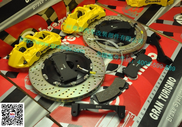 Brembo GT系列的制動套裝,其中卡鉗本體為對向6活塞卡鉗,全浮動散熱剎車碟盤具 有方向性之導風道以達最佳之冷卻效能,并且由于特殊鉆孔設計有效達到增加磨擦 力,持續清潔剎車盤并確保來剎車片與剎車盤之最佳磨擦咬合面。